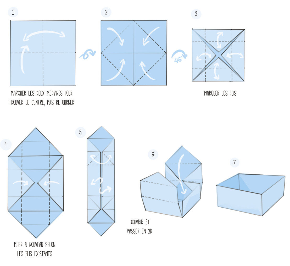 – Écarte les deux bords à la verticale (comme les bords d’une boîte) et rabat les deux pointes restantes jusqu’au fond de la boîte.