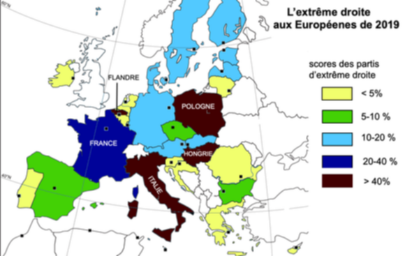Les résultats des élections européennes de 2019 sont un instantané à l’échelle de l’UE. L’extrême droite est présente dans presque tous les pays de l’Union, et même dominante dans trois d’entre eux (Pologne, Hongrie, Italie) et dans une région (Flandre). (© DR)