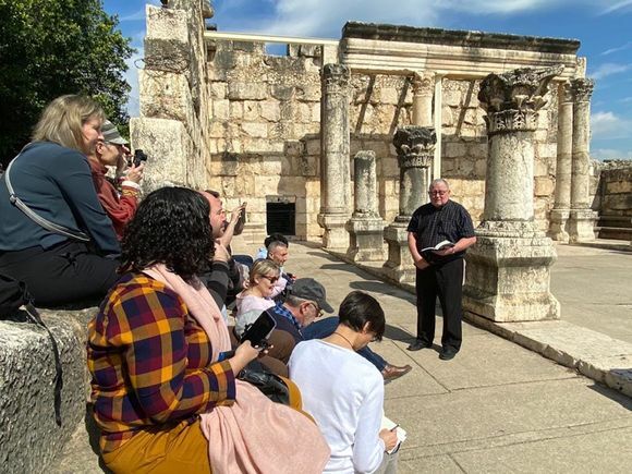 Moment de partage biblique dans les ruines de la synagogue de Capharnaüm