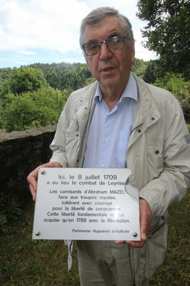 Il y a des lieux comme celui-ci qui parfois viennent réveiller les habitants, notamment celles et ceux pour qui l’Histoire a un sens. Comme dans beaucoup de lieux en Ardèche, la mémoire est gravée à tout jamais dans le paysage. C’est ici, au Serre des Fayolles, au-dessus du carrefour dit de Leyrisse, qu’a été installée, le 11 juillet 2009, une plaque commémorative rappelant une tragédie. À l’occasion du tricentenaire du mouvement camisard du 8 juillet 1709, et en présence d’une centaine de personnes, c’est l’association Patrimoine huguenot d’Ardèche qui a eu cette initiative lors de l’une de ses sorties. Patrimoine huguenot d’Ardèche est une société d’histoire du protestantisme vivarois, association loi 1901 qui, depuis 1995, découvre et fait connaître l’histoire du protestantisme en Ardèche. Son siège est à Privas.