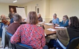 Fin octobre, Marie-Hélène et Pascale Gheysen sont arrivées, installées au presbytère. Après le Café du samedi matin que la paroisse offre, le jour du marché, nous nous retrouvons l’après-midi, d’abord entre paroissiens. C’est une grande joie de nous voir suffisamment nombreux et nombreuses autour des tables réunies. Nous reprenons le travail que nous avons fait en juillet, et comme nous sommes plus nombreux, un peu différents, et que, pour certains, nous avons déjà dit certaines choses en juillet, la production de notre groupe est plus abondante, plus approfondie, beaucoup de mots s’écrivent sur le tableau. Rapidement, avec tout ce qui s’exprime, les expériences partagées, nous ressentons que ce n’est pas rien ce qui se passe là, même si nous avions pensé que c’était peu de chose. Ces expériences nous donnent encore une Joie qui nous traverse : ce fut bon d’en refaire mémoire.