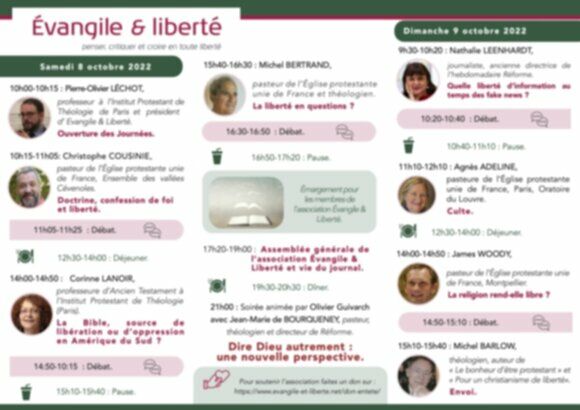 Ces 54es journées sont encadrées par Pierre-Olivier Léchot, président du mouvement du protestantisme libéral qui préside aussi l’assemblée générale annuelle de l’association. Les inscriptions sont encore possibles auprès de Jean-Claude Martin : martinsjctm@gmail.com
