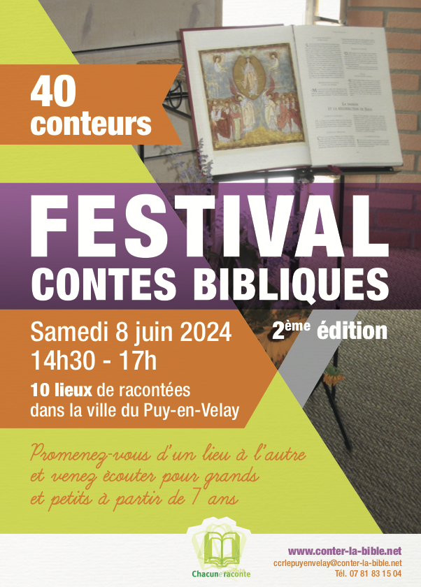 Depuis 1998, l’association « Chacun·e raconte, la Bible n’est pas un conte, mais se raconte » propose des contes bibliques. Le conte naît d’un travail de groupe : étude d’un texte, appropriation, travail d’imagination et de représentation, exercices d’oralité, recherche des enjeux du texte. Puis chacun, à partir de ce travail de groupe, et de son lien personnel avec le texte, crée sa propre histoire.