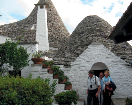 L’Italie du sud, ce ne sont pas seulement les ruines célèbres et les îles paradisiaques comme Capri, c’est aussi la plaine des Pouilles que les Italiens nomment « la Pouille ». Alors que ce mot pourrait évoquer une terre brûlée de soleil, à la végétation rare, quelle ne fut pas notre surprise de découvrir des champs et des prairies souvent verdoyantes, entourés de murs de pierres sèches parfaitement entretenus, et bien sûr, Italie oblige, des hectares de vignes et d’oliveraies ! Notre surprise fut aussi grande de découvrir à Alberobello d’étranges demeures en pierres sèches aux toits pointus : les trulli. Ces maisons servaient autrefois d’habitations à une population dominée par un tyran local qui obligeait ses paysans à détruire leurs habitations pour être moins taxés lorsque les envoyés royaux venaient collecter les impôts ! Les trulli hébergent maintenant des petits commerces.