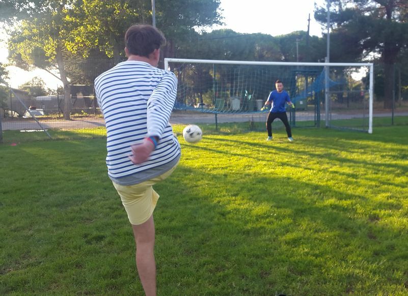 Lorsque j’arrive au stade, en fin d’après-midi, ils se mettent en place. Ce soir, Jonathan prend en charge deux jeunes autistes. D’emblée, ils semblent très différents l’un de l’autre : autant Mathis – physiquement costaud – est expansif, affectif, il interpelle et embrasse, autant Eliott, tout en légèreté, reste plus à distance et prend des précautions avant chaque mouvement. Jonathan, leur encadrant, soumet les deux jeunes à des exercices variés, autour de plots de couleurs différentes : repérages rapides, déplacements, avec des contraintes qui s’ajoutent au fur et à mesure. Dans les mouvements des deux garçons, on sent l’hésitation, ou au contraire la trop grande rapidité, au mépris parfois de la consigne ! Jonathan reprend, commente, mais ne fige pas les choses. Grand succès pour les tirs au but. Là, Eliott, quand il a réussi ou raté, exprime vivement ses sentiments, comme n’importe qui en pareille situation.