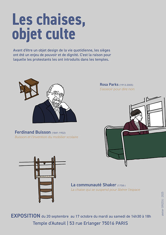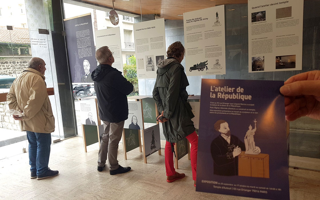 Deux expositions à découvrir au temple d'Auteuil du 20 septembre au 17 octobre : « L'atelier de la République » qui explore l'oeuvre du sculpteur Léopold Morice et le lien entre les protestants et la République ; « Les chaises, objet culte » qui montre les dimensions symboliques de ces objets du quotidien.