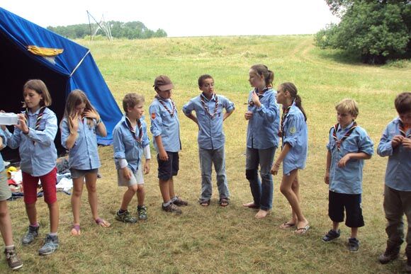 Cette année, le camp des éclaireurs est prévu à côté des Estrabols, dans le Tarn. Le camp essaie de respecter l’environnement. Ils réalisent leurs propres confitures et sirops. Ils se fournissent en produits locaux et réduisent autant que faire se peut la quantité de leurs déchets. Le camp n’est pas un camp « écolo » à proprement parler, car le projet cette année est de réaliser un jeu grandeur nature. Si vous avez été scout, vous vous souvenez sûrement avec émotion des « explos » (explorations) ; c’est le moment phare d’un camp, moment où un vent de liberté souffle sur le camp ! Les jeunes partent à l’aventure en petit groupe de six avec une carte, un sac de matériel et se débrouillent ! Bien sûr, les chefs vérifient que chaque groupe trouve un endroit pour dormir… Mais l’explo fait grandir, elle favorise l’écoute dans le groupe et oblige à l’argumentation pour prendre les décisions : faut-il aller à droite ou à gauche ? Normalement, après quelques aventures, la cohésion du groupe est renforcée. Pendant que les plus jeunes explorent, les chefs préparent la suite, essaient de réparer les marabouts qui lâchent, les voitures qui tombent en panne… car les galères font partie du camp scout… c’est la vie, on rigole et on rame !