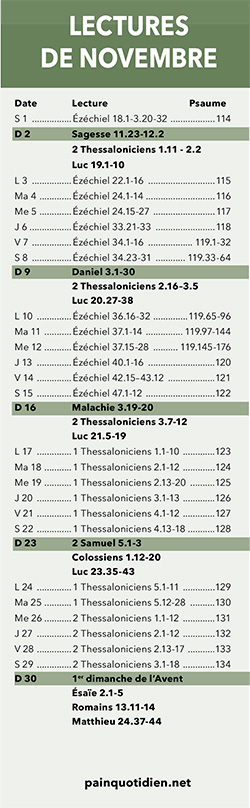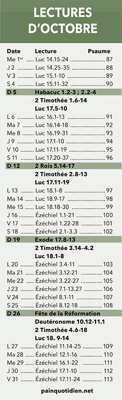 Les textes pour la lecture quotidienne de la Bible suivent la liste proposée par la Communauté de travail œcuménique pour la lecture de la Bible. Elle permet de parcourir une fois l’Ancien Testament et deux fois le Nouveau Testament en huit ans.