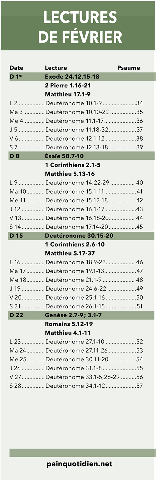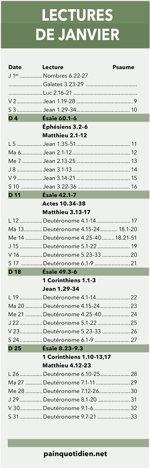 Les textes pour la lecture quotidienne de la Bible suivent la liste proposée par la Communauté de travail œcuménique pour la lecture de la Bible. Elle permet de parcourir une fois l’Ancien Testament et deux fois le Nouveau Testament en huit ans.