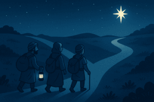 Connais-tu cette histoire ? Un jour, des savants venus de très loin voient une lumière étrange dans le ciel. Pas une étoile brillante comme dans les dessins animés : un signe, fragile, discret, qui leur donne envie de chercher. Ils se mettent en route. Ils traversent des villes inconnues. Ils se trompent de chemin. Ils posent des questions. Ils doutent. Et pourtant… ils avancent.