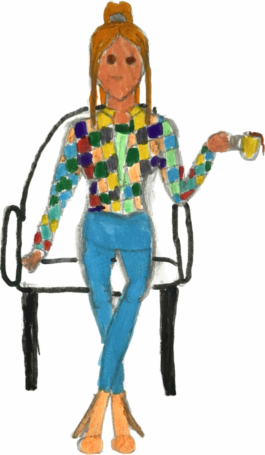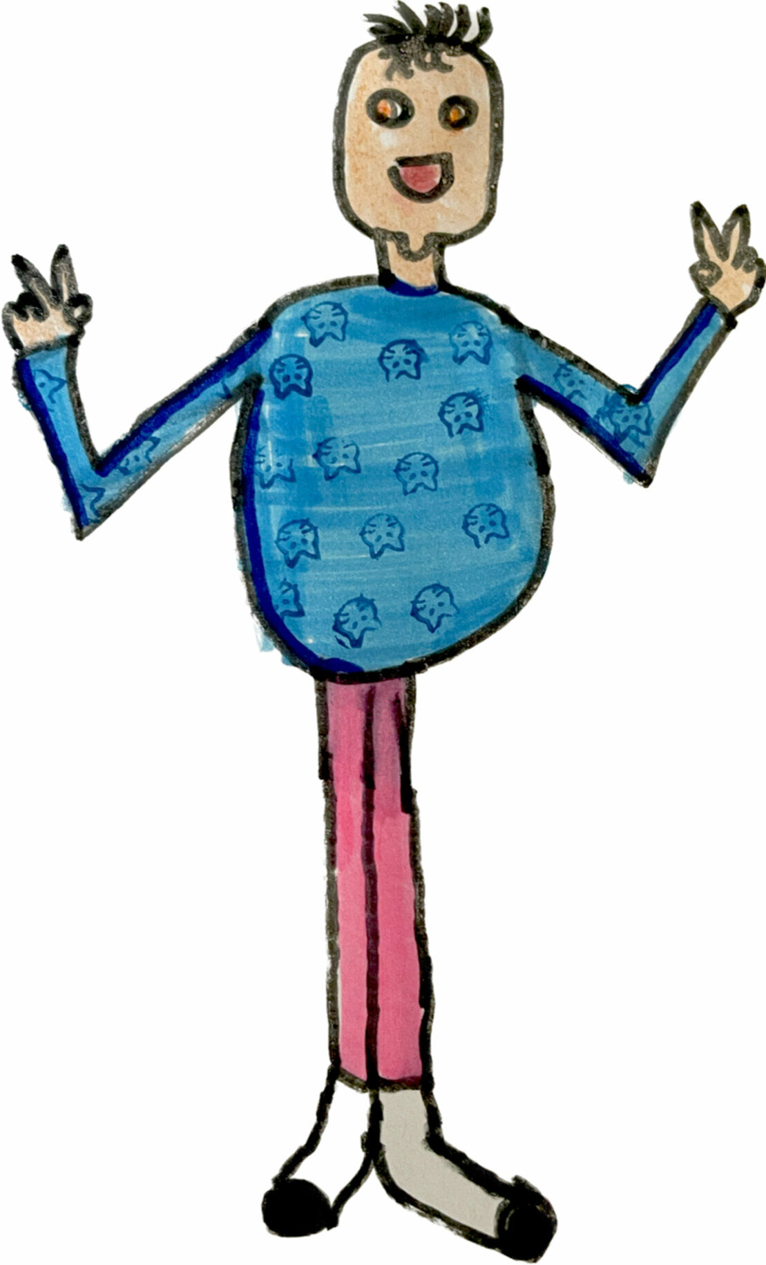 Pour Erwan, c’est compliqué. Il transpire tout ce qu’il peut et doit s’arrêter souvent pour essuyer la sueur de son front. Mais il s’applique, la langue tirée sur le côté. Et au lieu de faire des grands aplats de couleur, il peint des détails incroyables : la chemise d’un de ses bonshommes, il la peint avec des petits carreaux de toutes les couleurs. Sur les poches du pantalon et le long des coutures, il peint des motifs géométriques très compliqués.